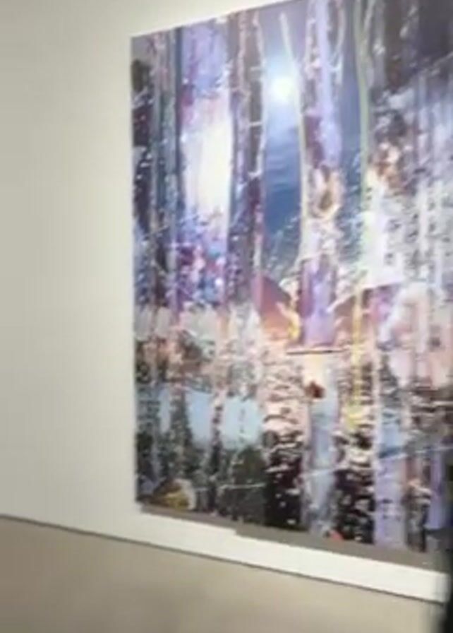 n art gallery bustling with people. The walls are white and adorned with large abstract paintings featuring a mix of colors and textures. People of various ages and styles are scattered throughout the room, some are in conversation, others are walking around, and a few are looking at their phones. The gallery space is well-lit, and there appears to be a reception or opening event in progress.