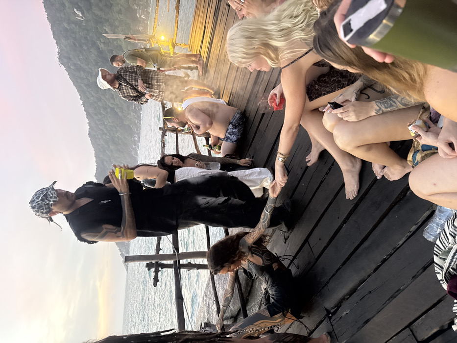 People gather on a wooden pier overlooking the water. Several individuals stand, sit, or lie down. A man in a black shirt and patterned bandana holds a yellow drink. A blonde woman in a bikini reaches out to a woman with heavily tattooed arms. Other people are visible in the background, some with drinks. Mountains are seen in the distance under a cloudy sky. The pier appears to be constructed of dark wooden planks.