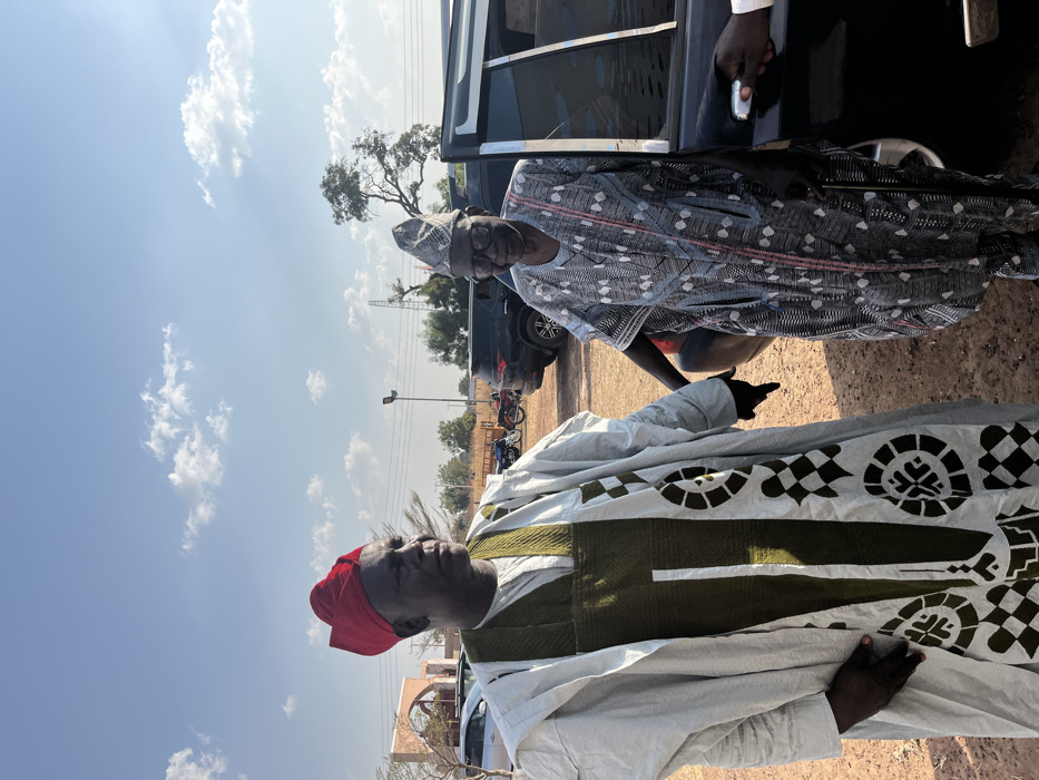 The image depicts two men in traditional attire standing outdoors on a dirt ground in Ajikemai, Nigeria, under a blue sky with scattered clouds