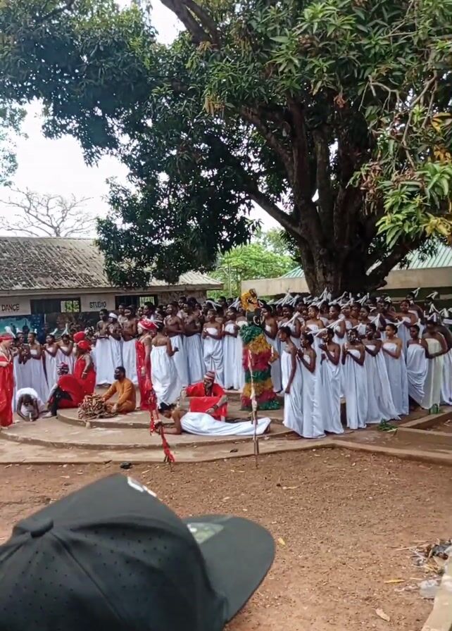 A large group of people, mostly wearing white robes and white headwear, are participating in some sort of ceremony or performance outside. There is a red clad individual moving around at the center of the circle and some seated individuals dressed in red. One man is lying on a white sheet. The event is taking place in an open area with a large tree overhead. A building with “DANCE STUDIO” written on it can be seen in the background. The shot is taken from the perspective of someone wearing a black baseball cap.