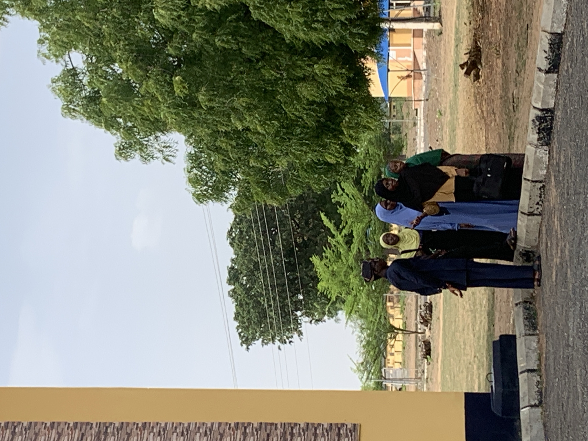 The scene depicts an outdoor environment in Unknown, Nigeria. Six individuals are positioned near a paved surface, a concrete curb with black and white markings, and a dry, open area. A partial yellow building structure with brown textured elements is visible on the far left. At the building's base, a dark rectangular utility box rests behind the curb. Six individuals are grouped in the right-center. One male subject, dressed in a dark suit and cap, stands facing right with hands clasped behind his back. To his right are five female subjects, all wearing head coverings. One female in a light yellow hijab and dark dress stands behind the male. Another female in a light blue hijab and dress gestures with her left hand. A third female, wearing a black hijab and light brown top, holds a dark briefcase in her left hand. A fourth female in a green hijab and patterned dress is visible behind her. A fifth female is partially visible on the far right. The background includes numerous green-leafed trees, overhead power lines, and several distant low-rise buildings, one featuring a blue roof section. The ground consists of asphalt, the curb, and dry, sparsely vegetated earth with visible tree stumps.
