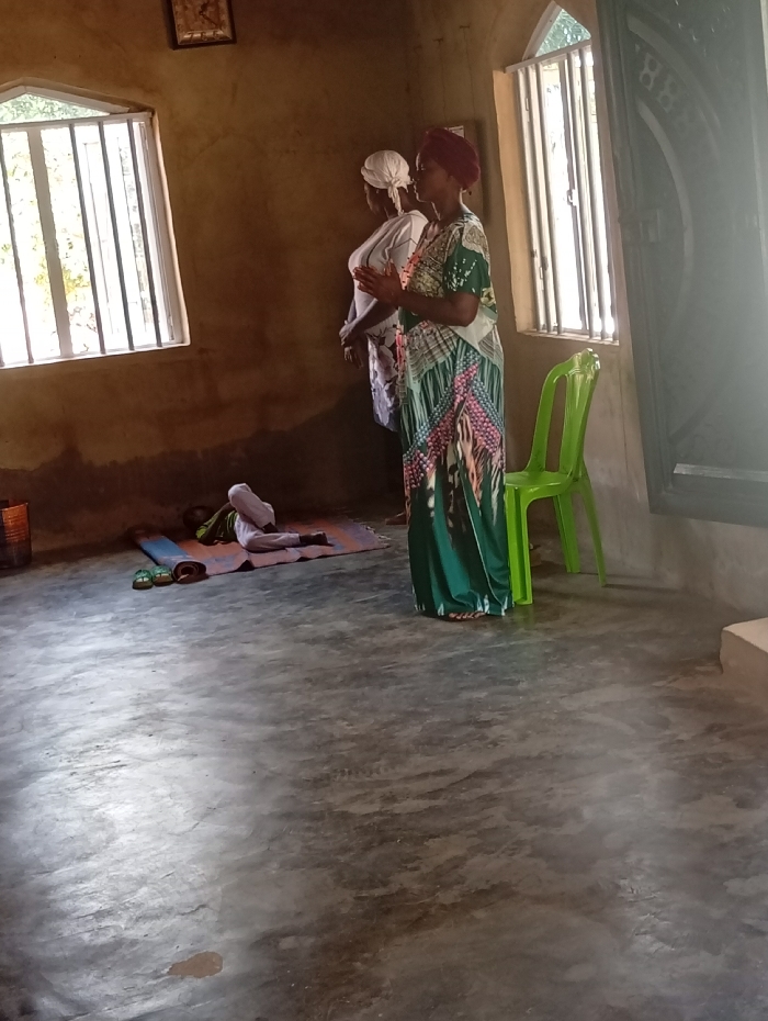 Inside a dimly lit room in Isinyi-Nando, Nigeria, three individuals are present. Two adult women stand in the middle ground, facing left. The woman in the foreground wears a patterned green, pink, and white dress with a red headscarf, her hands clasped in front of her chest. Behind her, another woman wears a white top and a white headscarf, also with hands clasped. On the floor to the left, a person in white clothing lies prone on a blue and white patterned mat, with a green fabric object nearby. Two pairs of sandals (one green, one brown) rest beside the mat. A bright green plastic chair is positioned to the right of the standing women. The room features light brown, textured walls, a grey concrete floor, and two windows with white bars, allowing natural light to enter. The left window is rectangular, while the right window has an arched top. Green foliage is visible outside the windows. A small, dark-framed picture hangs on the upper left wall. A dark, cylindrical container is partially visible on the floor in the far left corner. A dark, ornate doorway is partially visible on the far right.