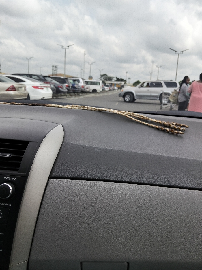 The image, captured from within a vehicle, features a dark grey dashboard in the foreground. Three bundles of dried, twisted fibrous material, light brown with dark striations, rest horizontally on the dashboard. A car stereo control panel, showing a "TUNE-FILE" button, is partially visible on the lower-left. Beyond the windshield, a paved commercial parking lot is visible under an overcast sky. A line of parked vehicles, consisting of sedans, SUVs, and vans, extends into the distance on the left. In the midground, a silver SUV is either stationary or moving. To the right of the SUV, two individuals are present: one wears a light pink top, and the other, dressed in a dark top, is pushing a metal shopping cart. Multiple tall streetlights with multi-lamp LED fixtures are positioned throughout the parking area. Distant structures in the background are indistinct. The scene depicts a commercial parking lot, characteristic of a shopping mall or large retail center, located within the city of Port Harcourt, Nigeria.