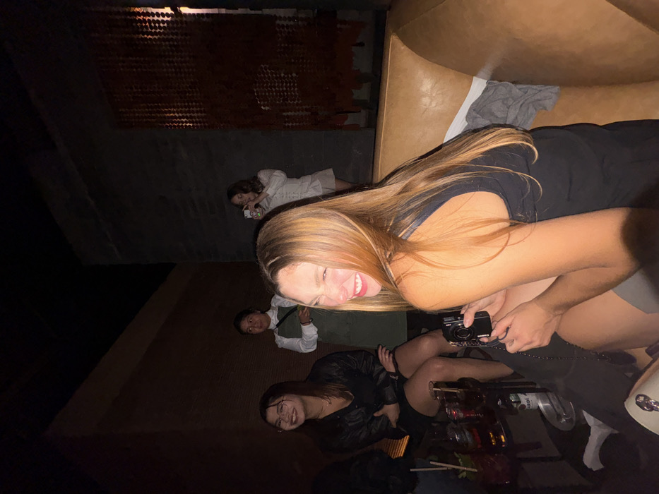 Four young women pose for a photo in a dimly lit setting, possibly a bar or club