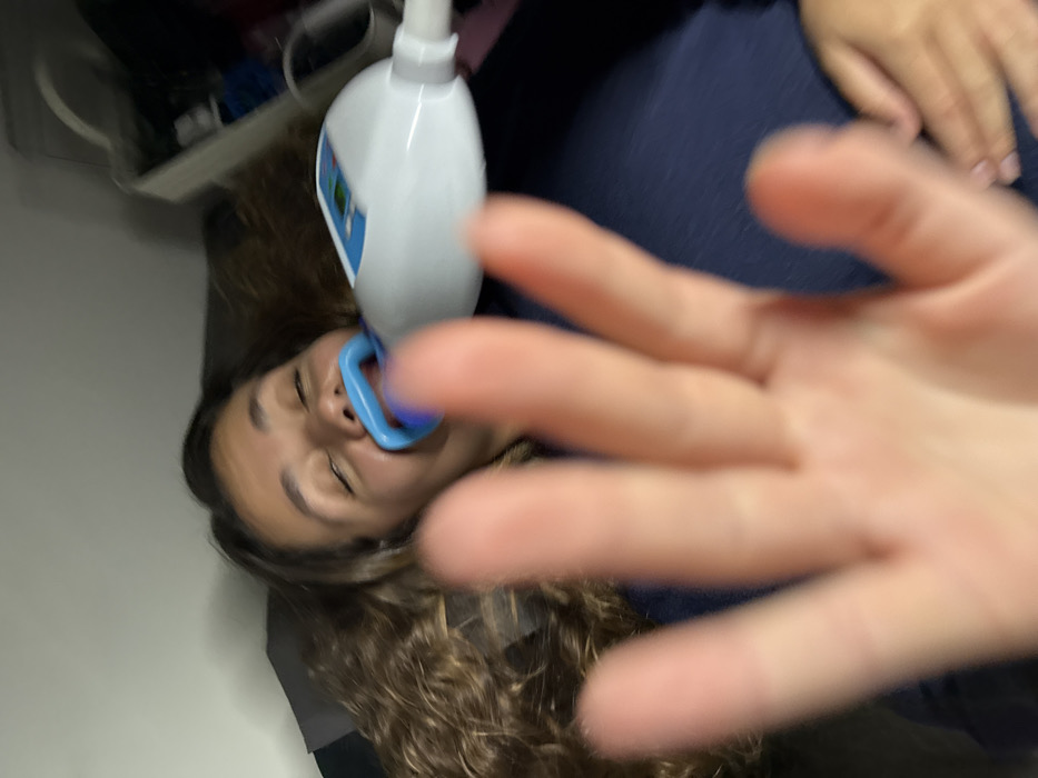 A woman is lying down with a teeth whitening device in her mouth. She has long, curly brown hair and appears to be smiling slightly with her eyes closed. A hand is out of focus in the foreground, partially obscuring the view. The background shows a white wall, and a piece of equipment is visible on the left. The dominant colors are white, blue, and brown.
