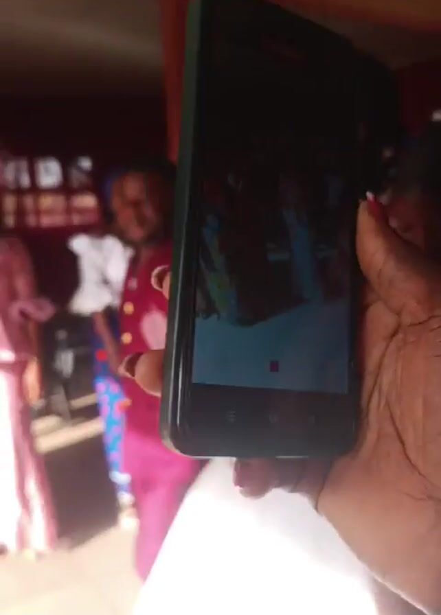 A person is using their cell phone to record a bride walking with other people. The bride has dark hair that is pulled back in a bun. She is wearing a white dress with beads across the top of the dress and chandelier style earrings. A person in a pink shirt with a hand fan is behind the bride. There are two women behind the bride to her right. One has on a gold colored dress and another has on a blue head wrap. There is music playing.