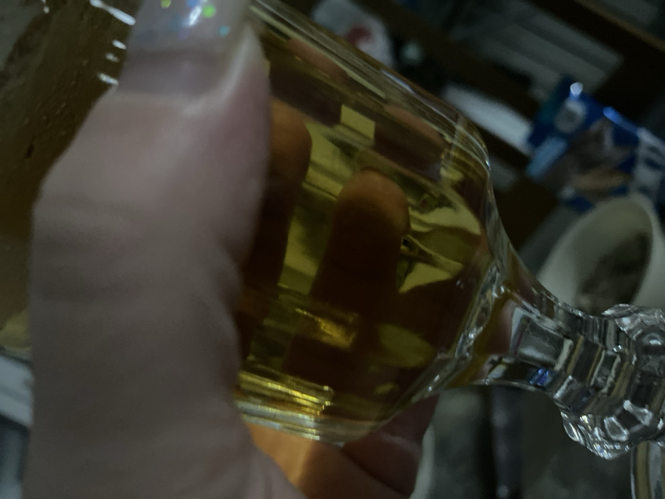 A person's hand holds a glass filled with a light amber liquid. The glass has a decorative, geometric stem and appears to be tilted. The liquid is somewhat translucent, and the person's fingers are visible through the glass. A glimpse of a cluttered background can be seen behind the glass, including what looks like a container of snacks and a white object. The person has a light skin tone, and at least one fingernail is visible with a light-colored, iridescent design.