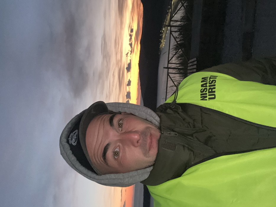 A person wearing a gray hooded sweatshirt and a bright yellow vest with "NISAM TURIST" written on it takes a selfie. The person has a baseball cap on underneath the hood. The background shows a sunset over a body of water. Silhouetted trees and what appears to be a lit structure are also visible.
