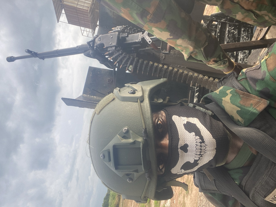 The image depicts an outdoor military scene in Zaki Biam, Nigeria, featuring two uniformed personnel and a heavy machine gun under an overcast sky