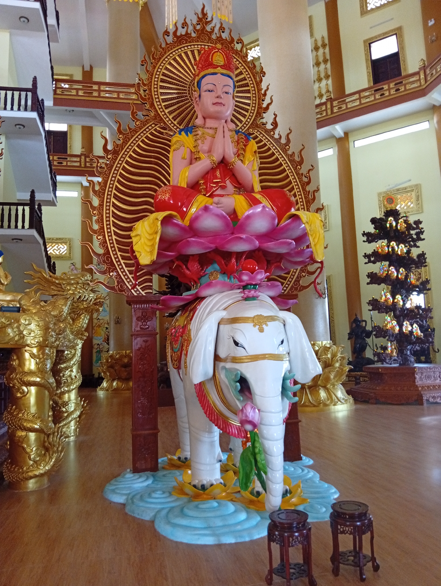 This image depicts the interior of a multi-level temple or pagoda located in Thiện Chí, Vietnam. The central subject is a large, colorful, multi-component statue prominently positioned in the center. The primary statue features a deity, possibly a Bodhisattva, seated cross-legged atop a large pink lotus blossom. The deity wears a red and yellow robe, gold jewelry, and a red and gold crown, with hands pressed together in a prayer gesture (anjali mudra). A large, ornate golden mandorla with radiating patterns and flame-like edges frames the deity from behind. This entire upper section is supported by a large, white elephant statue adorned with gold trim, red and green accents, and a decorative saddle. The elephant holds a pink lotus flower in its trunk and stands on a light blue base designed to resemble water, featuring yellow lotus flowers. To the left of the central statue, a large, intricately carved golden dragon statue is partially visible, coiled around a vertical structure. To the right, a dark, multi-tiered tree-like structure, possibly carved wood, displays numerous small, golden Buddha figures on its branches. A dark statue on a pedestal is visible further back on the right. In the foreground, two small, dark brown wooden stools with carved legs rest on the polished light brown wooden floor. The background reveals a spacious interior with light cream-colored walls adorned with gold decorative motifs and framed artworks. Large white pillars support the structure, and multiple levels are visible with dark wooden railings forming balconies. Windows on the upper levels provide ambient light. Hanging decorative elements are visible from the ceiling.
