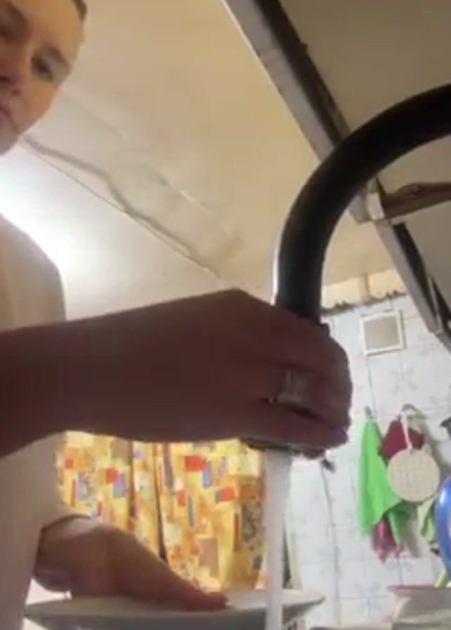 A person is standing in front of a kitchen sink washing dishes. The faucet is black and curved, and the water is running. The person's hands are visible, and they are wearing a ring. The kitchen appears to be small with patterned curtains, and there are some objects hanging on the wall to the right of the faucet. The camera angle is low, looking up at the person.