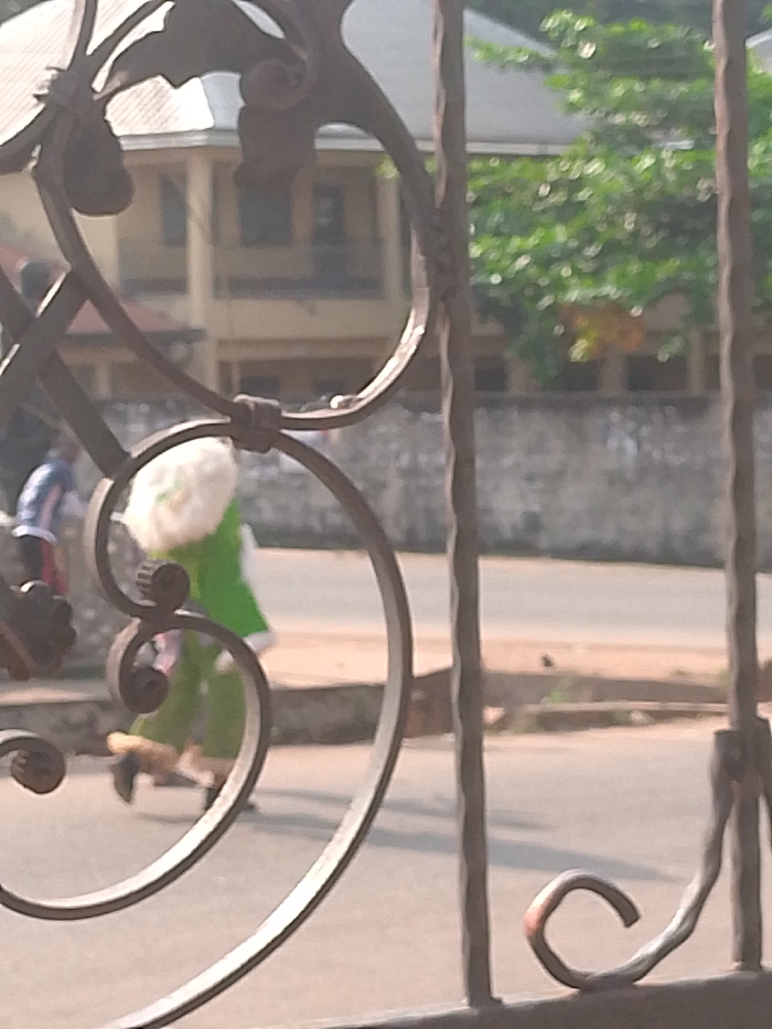 This image depicts a street scene in Neni, Nigeria, viewed through a blurred, dark wrought-iron fence with scrollwork in the foreground. A paved road is visible in the midground, bordered by a concrete curb. On the left, a person wearing a blue and white striped shirt is partially observed. Centrally, an individual is observed wearing a bright green garment and a voluminous white headpiece or mask; brown footwear is visible on this individual, who appears to be in motion. The background features a two-story building with a light-colored exterior and a sloped roof, along with green foliage visible behind a gray concrete wall. The scene is illuminated by natural daylight.