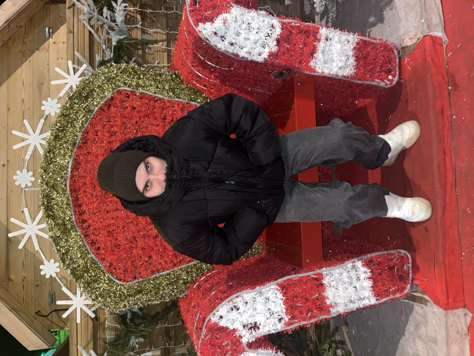 - "A person wearing a black puffer jacket, gray pants, white shoes, and a dark beanie sits on a Christmas-themed bench" by FM-2aYl13, licensed under CC BY 4.0