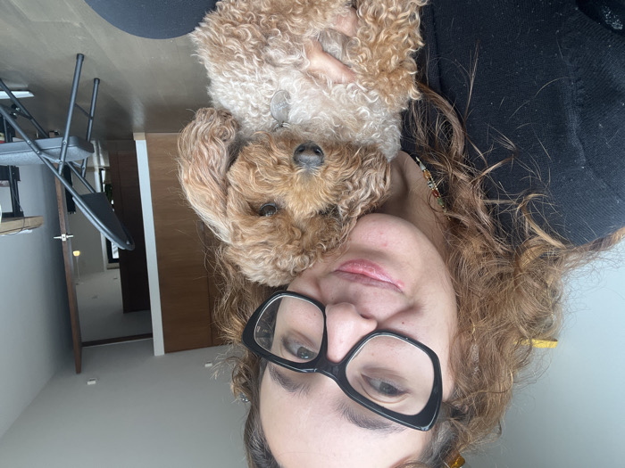 The image captures a headshot-style portrait of a woman holding a small dog indoors in Mexico City, Mexico. The woman, positioned in the left and central foreground, is Caucasian with curly reddish-brown hair, wearing black-framed cat-eye glasses, a black long-sleeved top, and a multi-colored beaded necklace. She displays a slight smile and looks towards the upper left portion of the frame. Her left hand is visible, supporting a small, curly-furred reddish-brown dog, consistent with a poodle or similar breed, which is held against her chest. The dog wears a collar with a discernible metal identification tag and looks generally towards the camera with a neutral expression. The background reveals a modern, minimalist interior space featuring light gray walls, dark wood flooring, and light brown wood-paneled doorways or architectural accents. Partially visible on the right are two dark gray folding chairs and a light-colored wooden table or desk. The scene is brightly lit.