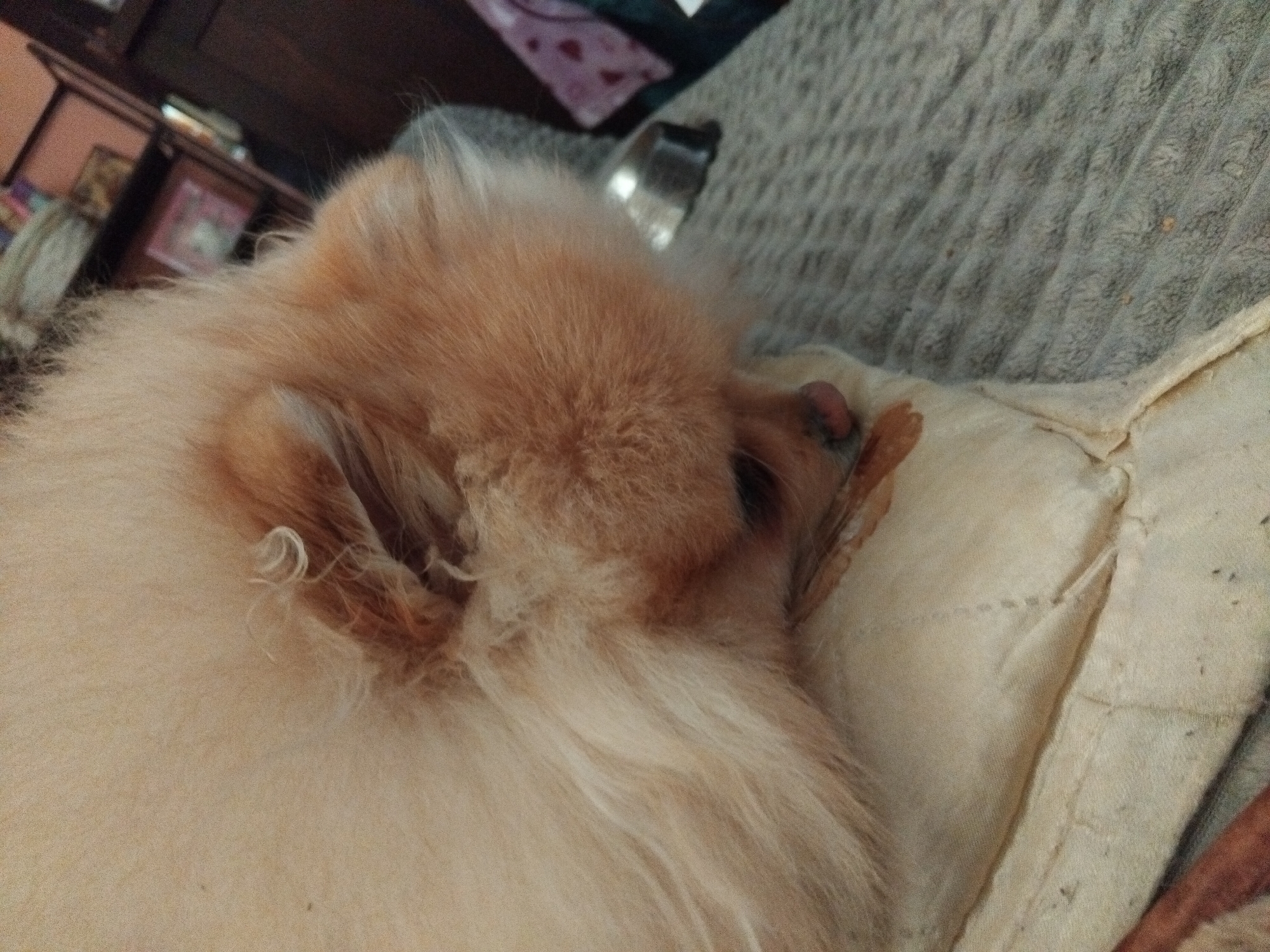 A close-up shows a golden-brown Pomeranian dog nestled on a light-colored, cushion-like surface. The dog's head is tilted, obscuring most of its face, but a small pink nose and curled fur around the ear are visible. Soft, fluffy fur covers the dog's body. Behind the dog, a grey textured material is discernible, possibly a blanket or upholstery. The background hints at a domestic setting with a blurred glimpse of furniture.