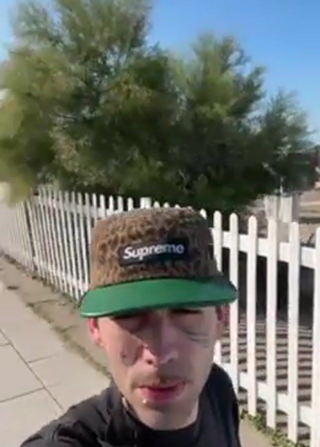 A man in a Supreme hat films himself on a sunny day, walking along a paved path next to a beach with white fencing and beach huts