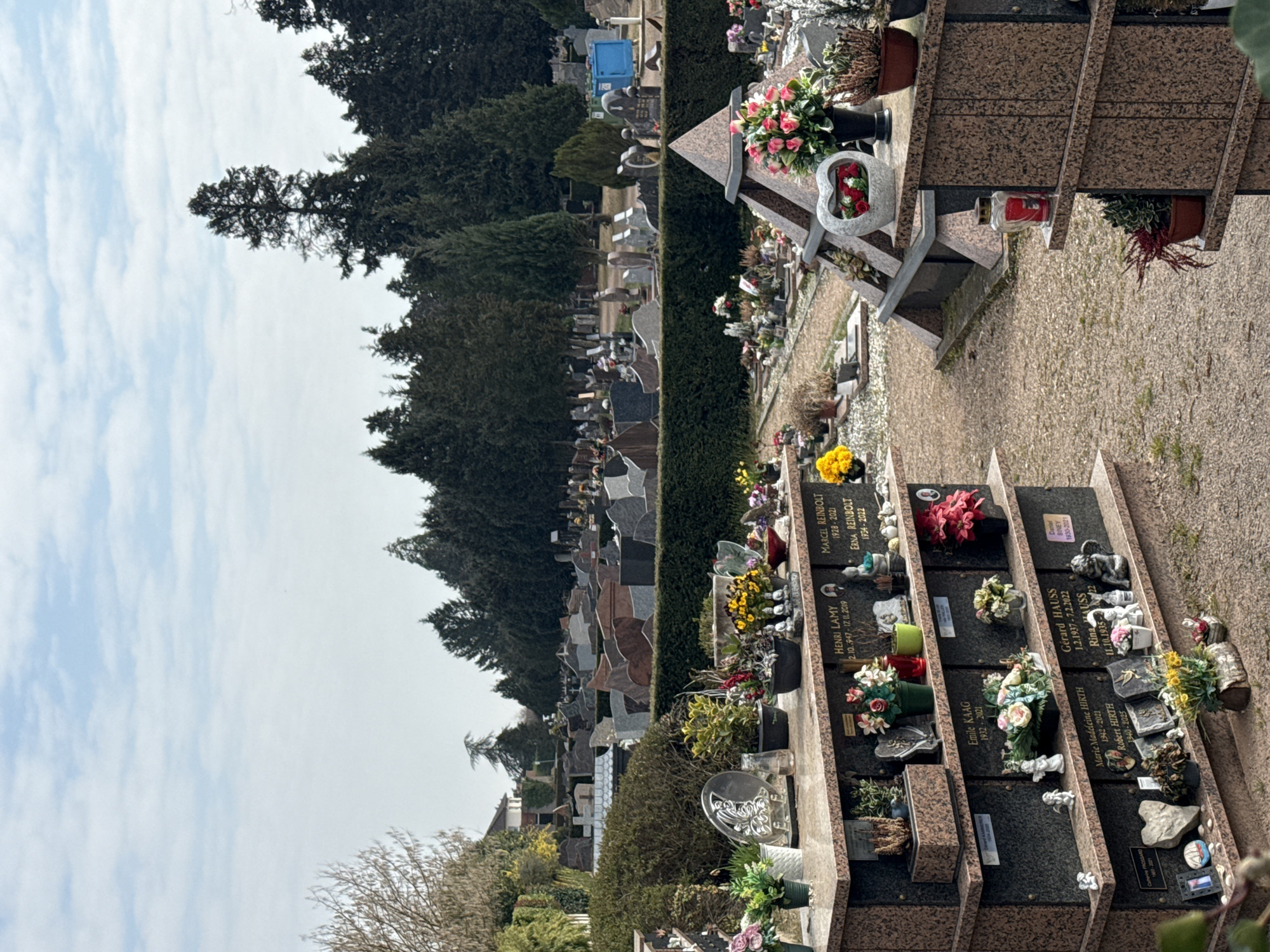 This image depicts a cemetery in Lingolsheim, France, under an overcast sky