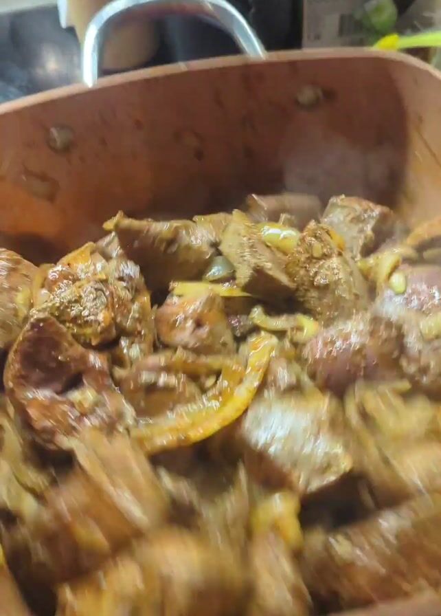 A copper colored square frying pan with a metal handle sits on a black glass stovetop. The pan contains a mix of browned bite-sized pieces of what appears to be liver, interspersed with translucent, caramelized onions. Steam rises from the hot mixture. The camera angle shifts slightly, revealing the number 9 lit up on the stove’s control panel. A wooden spatula is then used to move the food within the pan. The surrounding environment includes various containers and utensils in a kitchen setting.