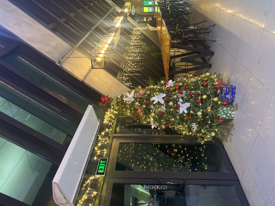This image depicts an interior commercial space, likely a cafe or lounge, situated in Siktarva, Georgia, during the evening. A decorated artificial Christmas tree stands prominently near glass double doors on the left, adorned with warm white string lights, red and gold spherical ornaments, and white poinsettia-like decorations. Two wrapped gift boxes, one green and one blue, are positioned at the tree's base. Above the glass doors, an illuminated green "EXIT" sign is visible, topped by a white horizontal air curtain unit and draped with yellow string lights. To the right, a long, narrow wooden table with dark metal "W"-shaped legs extends along the wall, accompanied by multiple dark metal bar stools. Overhead, linear black metal light fixtures with exposed bulbs hang from an angled, dark-paneled ceiling, below which more yellow string lights are draped in a cascaded pattern. One male individual, wearing a dark top and possessing dark hair, is seated at the far end of the long table, facing away from the camera, appearing to interact with an electronic device. The floor consists of light-colored tiles, reflecting the ambient lighting.