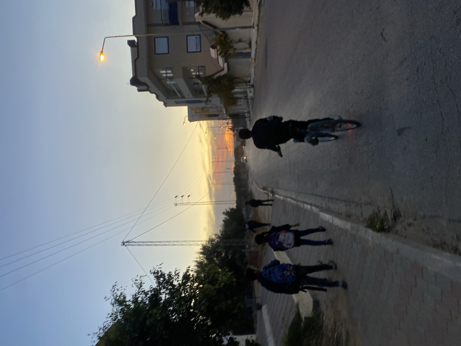 An evening scene in Kerker, Tunisia, captured at dusk as the sun sets. The sky displays a gradient of blue at the top transitioning to orange and yellow near the horizon. In the foreground and midground, six individuals are present. On the left, two individuals, likely children, walk away from the camera on a paved sidewalk. Both wear backpacks; the leading individual has a blue backpack, and the one behind has a light-colored backpack with a design. Further down the sidewalk, three additional figures are visible walking in the same direction. On the asphalt road to the right, a lone individual rides a bicycle away from the camera, dressed in dark clothing. The bicycle is dark-colored and appears to have a red rear reflector or light. The environment includes a paved road with a curb separating it from a paved sidewalk on the left. Green trees and bushes line the left side of the sidewalk. Utility poles, including a prominent lattice-structure pole, carry multiple overhead power lines across the scene. On the right side of the road, several multi-story buildings with light-colored facades and balconies are visible, along with illuminated streetlights. In the distant background, vehicle headlights are discernible on the road. The overall lighting is dimming, indicating the transition from day to night.