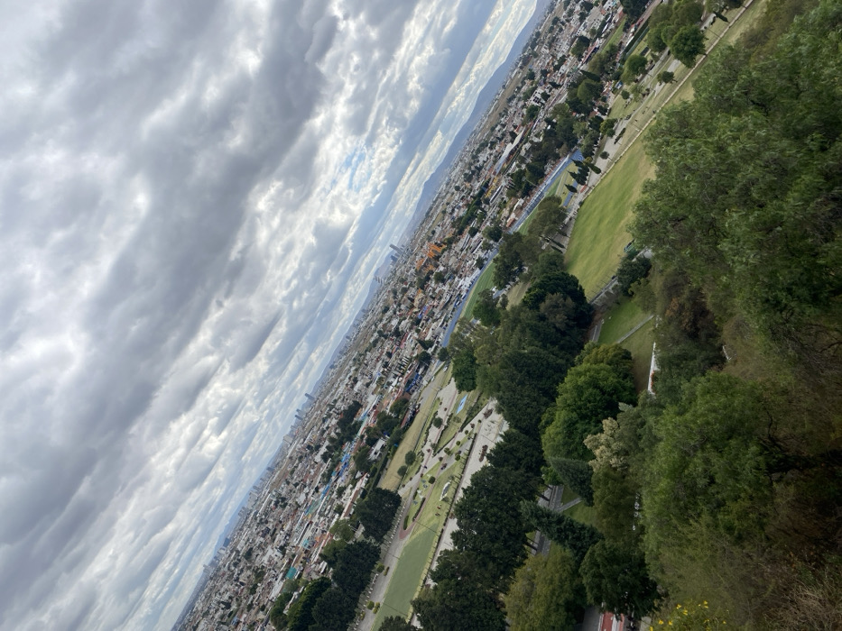 An aerial shot skewed diagonally reveals a cityscape under a cloudy sky. Buildings cluster tightly, stretching into the distance towards hazy mountains on the horizon. Green spaces punctuate the urban landscape, with a large green field and tree-lined parks in the foreground. The right side of the frame is dominated by dense foliage, possibly a hillside or park from which the photo was taken.