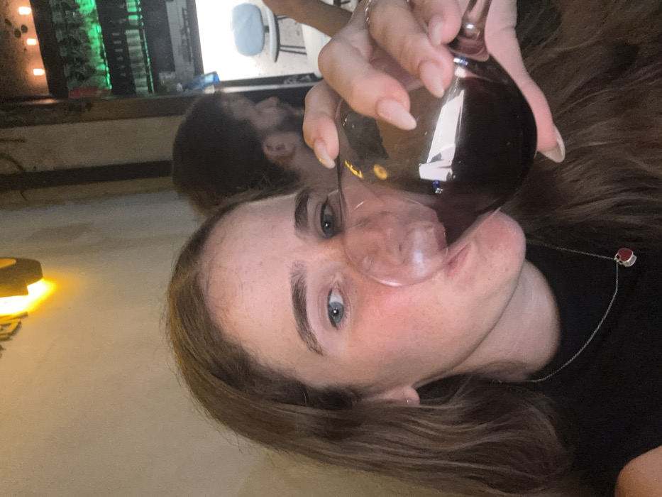 - "A close-up, selfie-style photograph depicts a young woman actively drinking from a wine glass inside a bar or restaurant, identified by Hebrew script on a background sign, likely in Tel Aviv, Israel" by FM-xh53C3, licensed under CC BY 4.0
