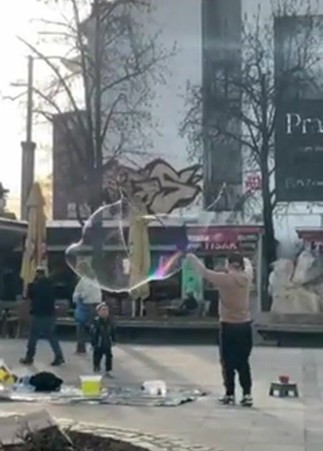 A man in a light brown hooded sweatshirt and dark sweatpants is creating giant soap bubbles in a public square using a rope and sticks. He raises the apparatus to release a large, iridescent bubble. A young child in a black jacket and pants watches the bubble and reaches for it. A bucket of soapy water and some other items are on the ground near the man. There are buildings in the background, one with a large advertisement, trees, and outdoor seating areas. Several other people are walking by in the background. The setting appears to be a European city on a sunny day.