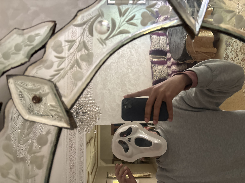 A person is depicted in a mirror selfie, holding a black smartphone with their right hand, partially obscuring their face with the phone. The individual wears a white "Ghostface" mask, a light grey long-sleeved shirt, and a pink undershirt visible at the left wrist. Their left hand is raised to the left side of their head. The mirror itself features an ornate, segmented design with etched glass panels displaying floral and geometric patterns, held together by visible fastenings. Reflected in the mirror is a traditional Moroccan interior, likely a salon, located in Fez, Morocco. The background reveals a white ceiling with intricate, recessed geometric plasterwork patterns and gold trim. A multi-tiered crystal chandelier hangs centrally from the ceiling. The walls are light-colored, possibly textured, with faint decorative patterns visible. Furniture includes a low-slung seating arrangement with purple and gold patterned upholstery and cushions, characteristic of a Moroccan seddari. A round, low table covered with a gold tablecloth is visible in front of the seating, alongside another dark-covered object. A patterned rug is partially visible on the floor. A doorway or window with a light frame is seen in the far left background.