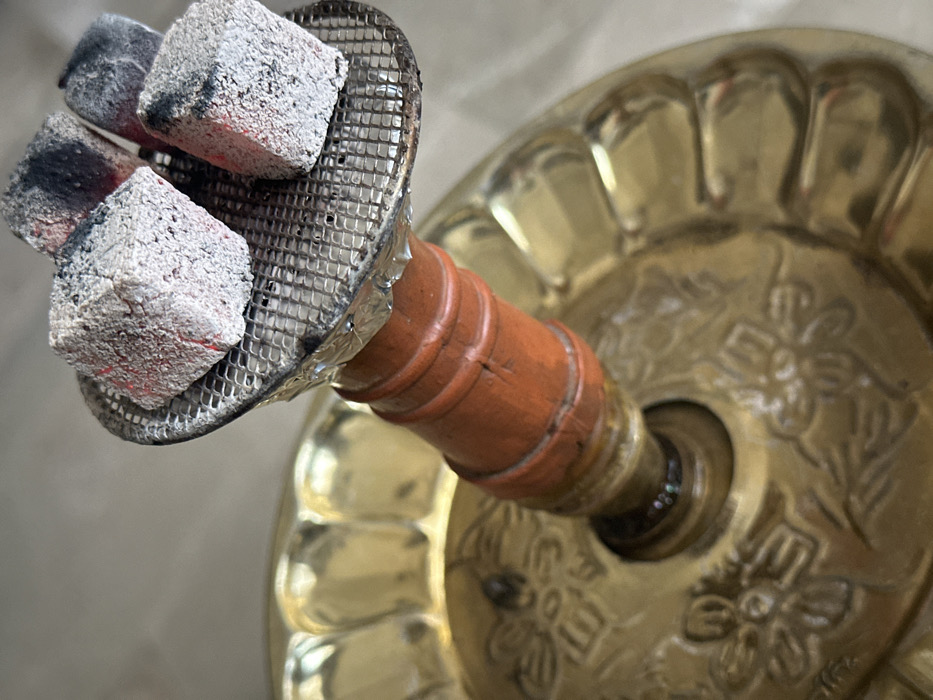 A close-up, downward-angled photograph depicts the upper portion of a hookah (shisha) setup at an unspecified indoor location in Unknown, Unknown