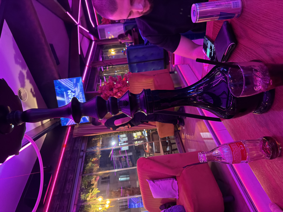 The image depicts an indoor scene within a lounge or bar, likely a hookah establishment, located in the city of Sofia, Bulgaria. The environment is illuminated predominantly by purple and magenta neon lighting, casting a strong hue across the space. In the foreground, a dark, ornate hookah pipe stands prominently on a polished wooden table. To its left, an empty clear glass Coca-Cola bottle with a red label is present, containing a small amount of dark liquid. To the right of the hookah, a clear glass with a Coca-Cola logo contains a dark beverage and a black straw. Further right, a silver metallic can rests next to a closed black wallet and a dark-colored smartphone, which is being held by a male individual. This male, partially visible on the right, has short hair and a beard, and wears a black t-shirt. He is looking down at his phone. In the mid-ground, a male figure wearing a dark t-shirt stands facing away from the camera, near a brightly lit window. Beyond him, an arrangement of red or pink artificial foliage serves as a decorative element. Seating arrangements include a red upholstered sofa with a light-colored pillow on the left, and several other upholstered chairs in red, orange, and blue further back. The background features large windows revealing a blurred night-time cityscape, with visible streetlights, building lights, and vehicle lights reflecting on the glass. The ceiling is dark with scattered white, cloud-like patterns and embedded strip lighting. Other patrons are visible in the background, seated at tables, largely obscured by the lighting and depth of field. An air vent is visible on the ceiling. The floor appears to be a reflective surface.