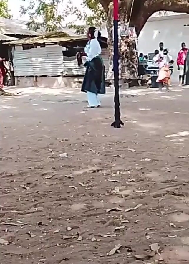 The scene captures an outdoor gathering under the partial shade of a tree and a white canopy. A woman stands at the center of the frame, clad in a white top, dark green skirt, and light blue trousers, holding what appears to be a microphone. Several other individuals are scattered in the background. To the left, there is a tin structure, while a table with equipment, possibly for music or sound, sits on the right. The ground is bare earth, covered with dried leaves and debris.
