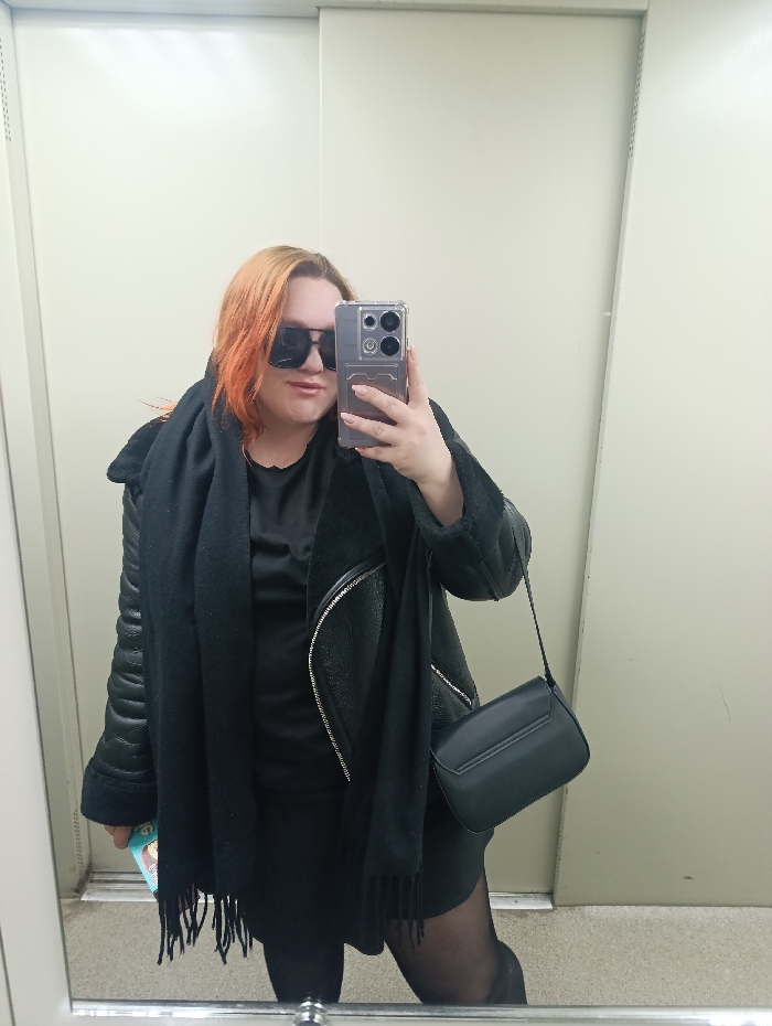 An individual is captured in a mirror selfie within an elevator in Rostov-on-Don, Russia. The subject is a female with shoulder-length orange-red hair, wearing large black sunglasses. She is dressed in a black long-sleeved garment, a black textured jacket with prominent silver zipper details, a voluminous black fringed scarf, black sheer tights, and black boots. In her right hand, she holds a clear-cased smartphone, angled to take the picture. A small black shoulder bag is visible on her left side. Her left hand partially holds a card displaying a cartoon character. The elevator interior features light beige wall panels with vertical seams, indicating the sliding doors, and a metallic trim visible at the base of the mirror.