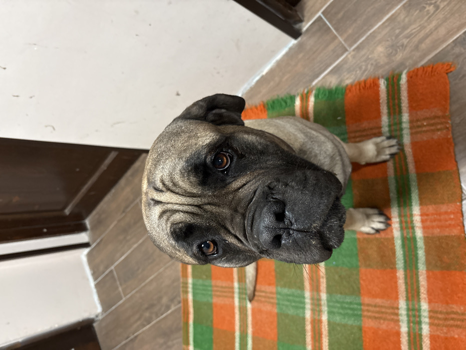 A fawn and brindle-colored Bullmastiff or similar Mastiff breed dog is depicted indoors in Strashimirovo, Bulgaria, looking directly towards the camera with an attentive expression