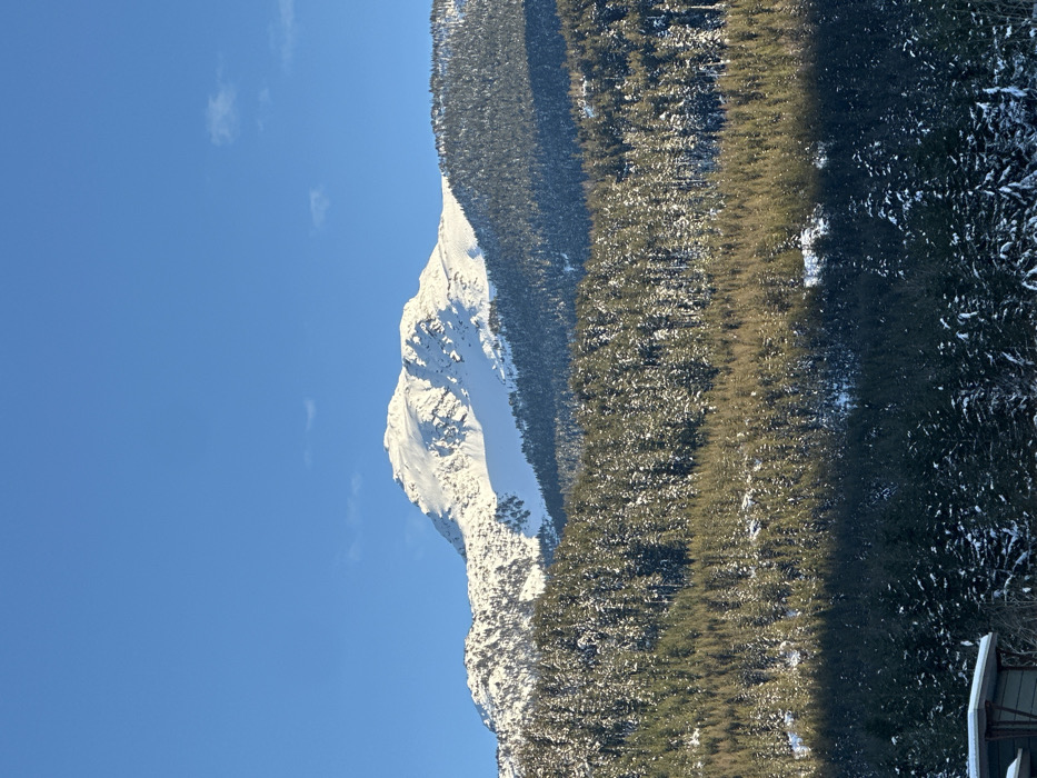 A landscape shows a snow-covered mountain under a clear blue sky. A dense forest of evergreen trees abuts the base of the mountain, gradually transitioning from snow-dusted on the sunny side to deeply shaded on the other. Some sort of man made structure is visible on the bottom right.