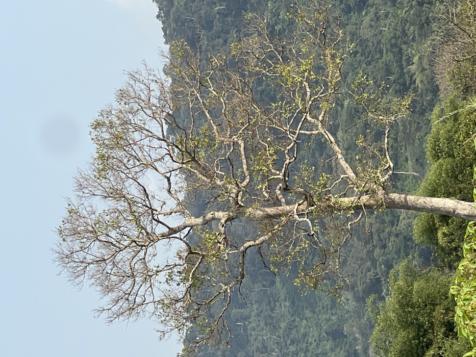 The image depicts a natural outdoor scene in Wuinta, Ghana. A large, mature deciduous tree stands prominently in the foreground, characterized by a light-colored trunk and an extensive network of visible bare branches. Sparse clusters of green leaves are present on various branches, predominantly in the lower and middle sections of the canopy. The background consists of multiple layers of densely forested hills, appearing a muted green and receding into a slight atmospheric haze. The sky above is clear and light blue. No human subjects, animals, or artificial structures are present within the frame.