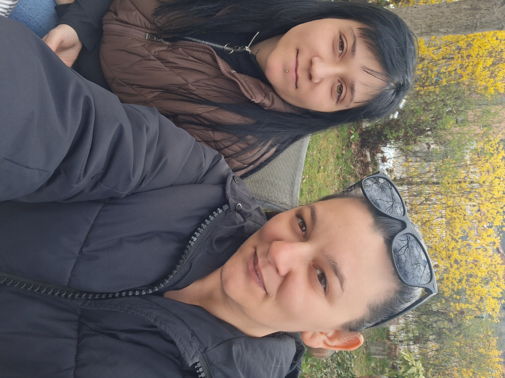 Two women pose for a selfie outdoors. The woman closest to the camera wears a black puffer jacket and has sunglasses resting on her head. The second woman, situated behind her, wears a brown quilted jacket. She has dark hair and a lip piercing. The background features a tree with vibrant yellow flowers and greenery suggesting it is springtime. The setting appears to be an urban area, with elements typical of residential or park-like settings. The location is the city of Goce Delcev, Bulgaria.