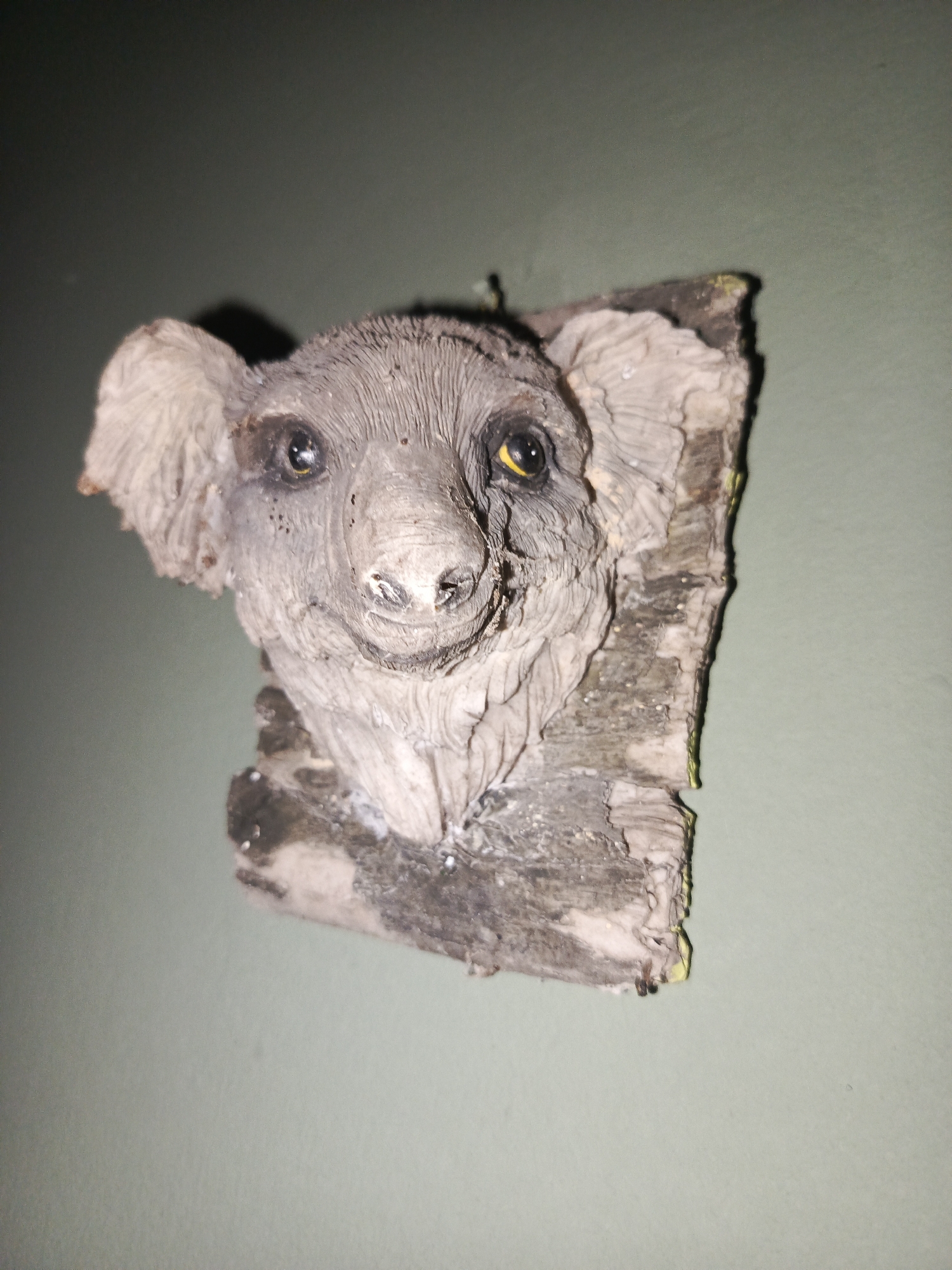 wall-mounted sculpture of a koala's head attached to a piece of wood