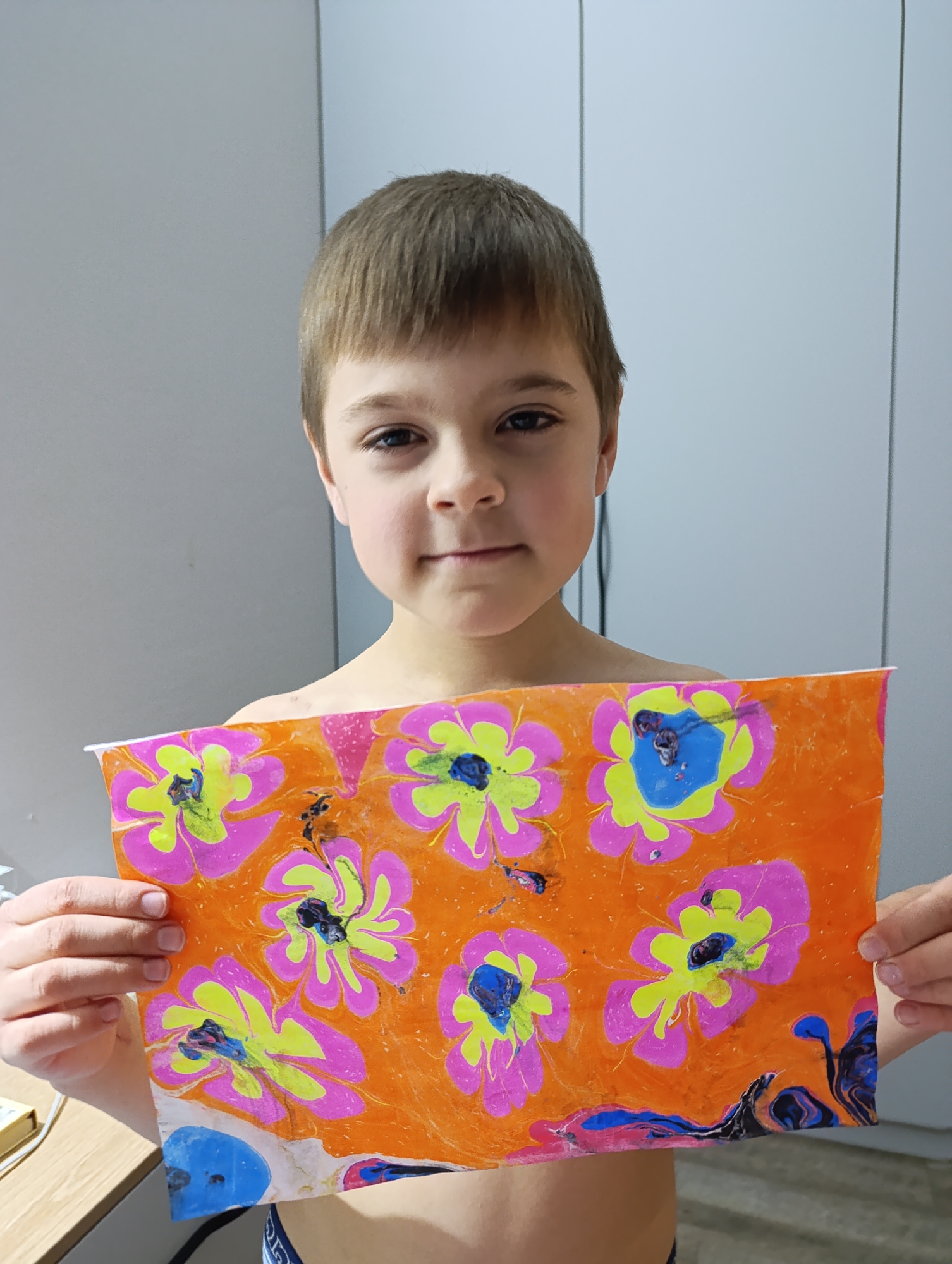 A young boy with short brown hair is holding up a colorful painting in front of a gray and white paneled wall. The painting is orange with pink, yellow, and blue floral designs. The boy is shirtless. Part of a wooden table and a small box are visible on the left edge of the frame. The location is Chaikovsky, Russia.
