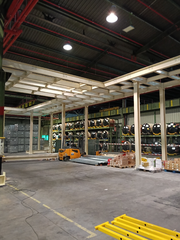 The image depicts an indoor industrial warehouse or factory facility located in the city of Burgos, Spain. The floor is grey concrete, marked with a yellow line extending from the foreground to the mid-ground. In the immediate foreground, several yellow rectangular metal beams are stacked on the floor. A black electrical cable extends across the floor from the left foreground. A prominent light-colored metal structural framework, composed of vertical columns and overhead horizontal beams, occupies the mid-ground. This structure appears to be either part of the building's infrastructure or an ongoing installation. An orange industrial forklift is parked in the mid-ground, oriented to the left. To its right, a stack of flat, corrugated metal sheets rests on a wooden pallet. A red cylindrical object is situated in front of these sheets. Further to the right, multiple wooden pallets are laden with cardboard boxes, some of which are wrapped in clear plastic. The background features extensive industrial shelving units. To the left, stacks of silver-colored rectangular containers are stored. To the right, tall metal racks hold numerous black, cylindrical objects, likely coiled materials or drums, many secured with silver bands. Some shelves bear yellow or green markings and numerical labels, such as "213." Red and white striped barrier tape is visible on one of the shelving units. The ceiling consists of a dark corrugated metal roof, from which two bright industrial pendant lights are suspended and illuminated. Red piping, likely part of a utility or fire suppression system, runs horizontally across the exposed ceiling structure. No individuals are present in the scene.