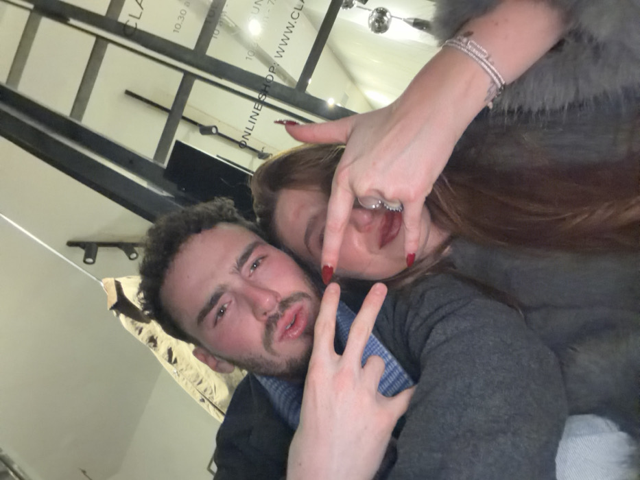 A selfie shot shows a man with curly hair and a beard wearing a blue checkered shirt and a black jacket. He is throwing up a peace sign. Behind him is a woman with long red hair. She is making a "V" sign with her fingers covering her left eye. The background includes a brightly lit store with the words "ONLINE SHOP: WWW.CLAS" visible.