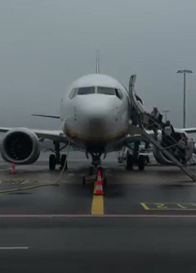 static, eye-level shot of a passenger plane on an airport tarmac during overcast weather. Passengers are seen climbing the steps attached to the front of the plane to board. A yellow line is visible on the tarmac, along with a traffic cone, and what appears to be a hose.