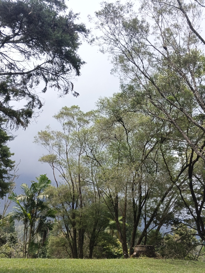 A verdant scene unfolds with a backdrop of ominous grey clouds. Tall trees with varying shades of green dominate the view, their branches reaching towards the sky. A palm tree adds a tropical touch to the landscape. Below, a carpet of bright green grass covers the ground. In the middle of the shot there is also a big tree trunk which could also work as a seat.