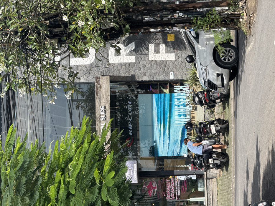 surf shop with the word "RIP CURL" prominently displayed on the building's facade. A large poster featuring a wave scene is displayed next to the surf shop's name. A car and several motorcycles are parked in front of the store. A man appears to be interacting with one of the motorcycles. Lush greenery, including trees and bushes, frames the building on the sides. Overhead power lines and other businesses are visible in the background.