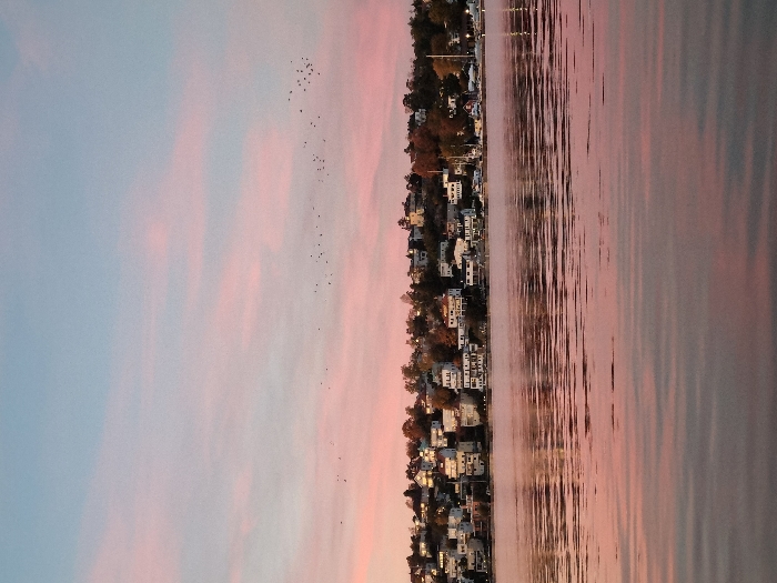 The image depicts a sunset over a body of water in Stockholm, Sweden, specifically showing the residential shoreline of Lidingö, likely viewed from the water of Lilla Värtan or an adjacent strait. The sky occupies the upper half, transitioning from light blue at the zenith to soft pink and orange hues near the horizon, indicative of late evening light. Wispy, horizontally stretched pink clouds are present. A flock of approximately 40-50 small, dark birds is visible in the mid-ground sky, flying horizontally from left to right. The middle ground features a landmass rising gently from the water, densely populated with numerous light-colored, multi-story residential buildings (houses and apartment blocks) nestled among trees. Many buildings are white or off-white with varying rooflines. Patches of trees, some exhibiting autumnal brown and orange foliage, are interspersed among the structures and along the hillside. Along the water's edge on the Lidingö shore, a marina or docking area is discernible, with several boats, including sailboats with masts, moored. The foreground consists of calm water, reflecting the pink and orange tones of the sky and showing subtle horizontal ripples across its surface. No individuals or direct human activity are visible in the scene.