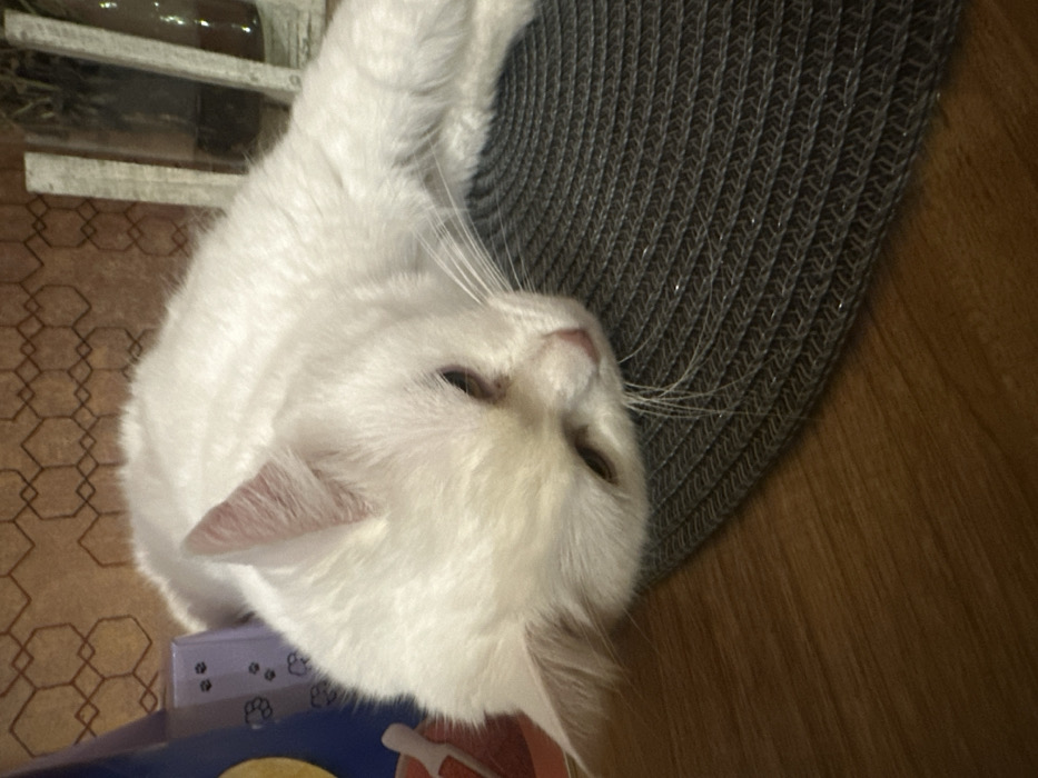 A white cat with pink ears rests on a gray woven surface. Its eyes are mostly closed. The cat partially sits on a purple box with paw print decorations. The background shows a window with a decorative frame, a patterned floor, and a wooden surface. The image is oriented vertically.