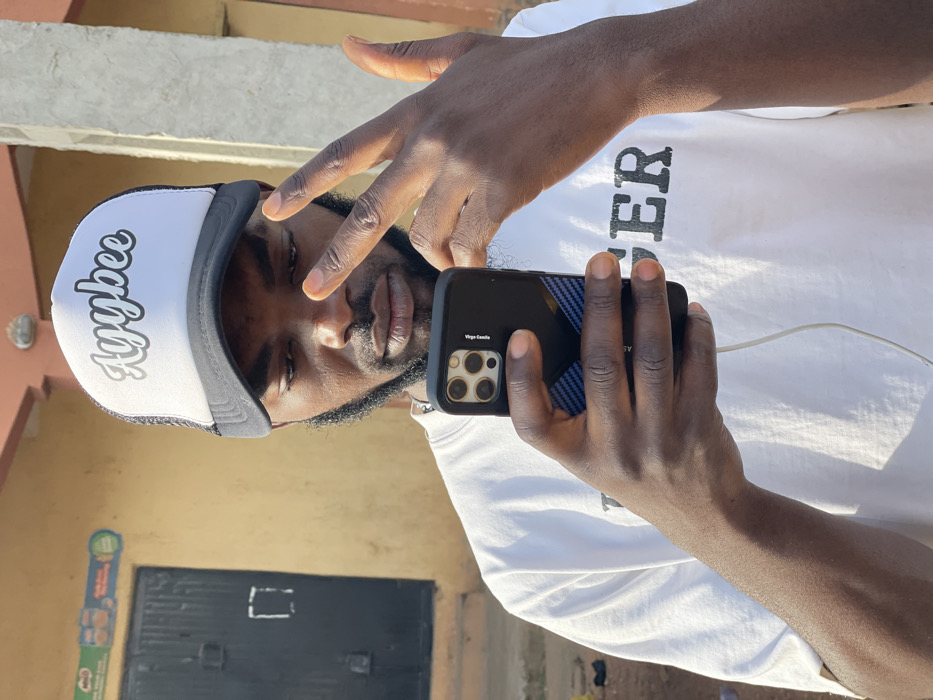A man poses for a selfie outdoors. He's wearing a white shirt with black writing, a white baseball cap with "Ayybee" written on the side, and he's holding a black phone with a blue patterned accent on the back. He is holding up two fingers, and a building with a closed black door is partially visible in the background. It is a bright, sunny day.