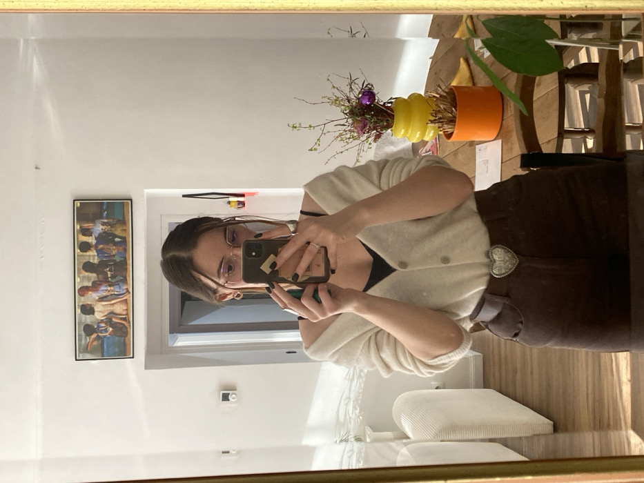 A young adult female is depicted in a mirror selfie taken within a domestic interior, identified as a private residence in Lille, France. The subject, with dark hair parted centrally and wearing glasses, holds a dark-colored smartphone with a light-colored case in both hands, capturing her reflection. She is dressed in a light beige V-neck cardigan over a black top, dark brown trousers, and a prominent silver-colored heart-shaped belt buckle. Rings are visible on the fingers of both hands, and her fingernails are painted dark. The background, visible in the mirror's reflection, consists of white walls. A horizontal framed artwork featuring multiple figures seen from behind, positioned by water, hangs above the subject's head. To the left, a white square-shaped thermostat or control unit is affixed to the wall. A curved, light-colored sofa or armchair is partially visible on the far left. To the right of the subject, a wooden table holds a yellow rippled vase containing branches with leaves and a purple decorative bauble, alongside an orange cylindrical pot with dried twigs. A small green plant is partially visible in the bottom right corner. A doorway or archway is present behind the subject, leading to another room, with a small red shelf visible within it. The flooring is wood. The scene is brightly lit, indicating daytime conditions.