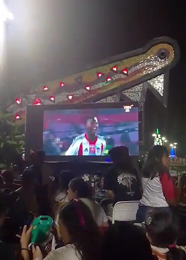 crowd of people seated outside at night, watching a large screen showing video clips of sporting events. The screen is set up on a stage-like structure. The stage has a large alligator head shaped structure above it, decorated with lights. People are sitting in chairs, some are eating and drinking. Some are looking at their phones. There's a street lamp to the left of the screen, creating a bright spot in the frame. In the background, you can see street lights and lit-up Christmas tree shaped decoration. The camera is positioned behind the crowd, capturing their reactions to the screen.