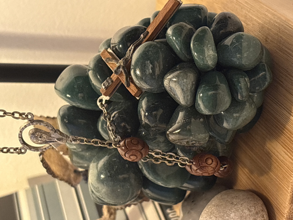 - "The indoor scene, located in Valencia, Spain, presents a silver-colored rosary draped over a mound of smooth, dark green, polished stones" by FM-9Yocj1, licensed under CC BY 4.0