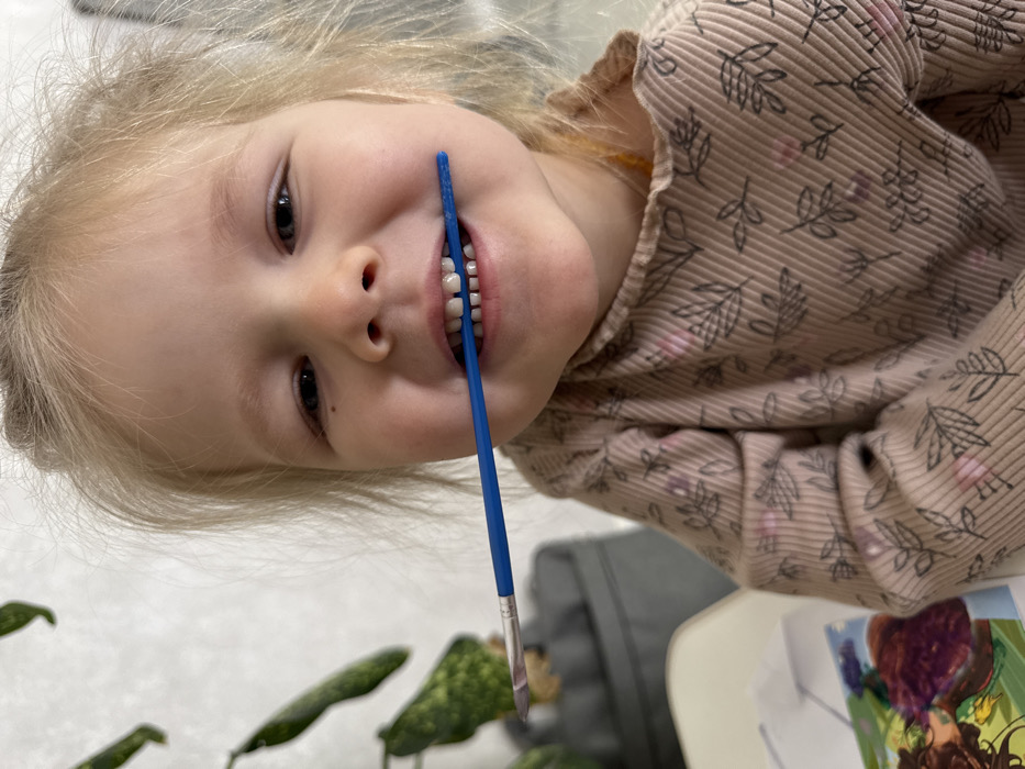 An indoor scene in Gornyi (Dvurechenskoe S/P), Russia, depicts a young blonde-haired child, estimated to be a toddler, from the chest up, looking directly at the camera. The child is smiling, revealing upper and lower primary teeth, and has a blue-handled paintbrush held horizontally between the front teeth. The paintbrush tip appears light-colored, possibly white or silver. The child wears a long-sleeved, ribbed, light beige or light brown shirt with a dark leaf pattern and faint pink accents. A necklace composed of light amber-colored beads is visible around the child's neck. A small dark mole or mark is present below the child's left eye. In the blurred background to the left, a portion of a plant with green, elongated leaves is visible, along with a dark gray object, possibly a container or part of furniture. In the lower-left foreground, a fragment of a colorful object, consistent with a book or artwork featuring purple and brown elements, rests on a light surface. The background wall is light-colored and out of focus.